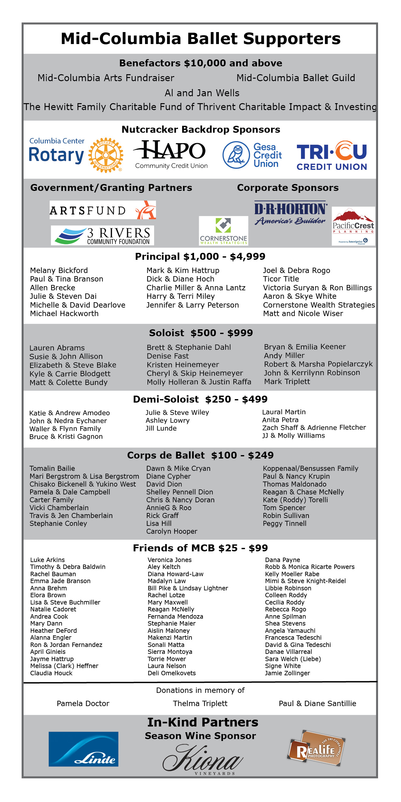 The Mid-Columbia Ballet (MCB) is incorporated in Washington State as a non-profit corporation and is exempt from federal taxes under Section 501(c)(3) of the Internal Revenue Code. For more information on MCB’s finances, including funding spent on programs, do a charity search at https://ccfs.sos.wa.gov.